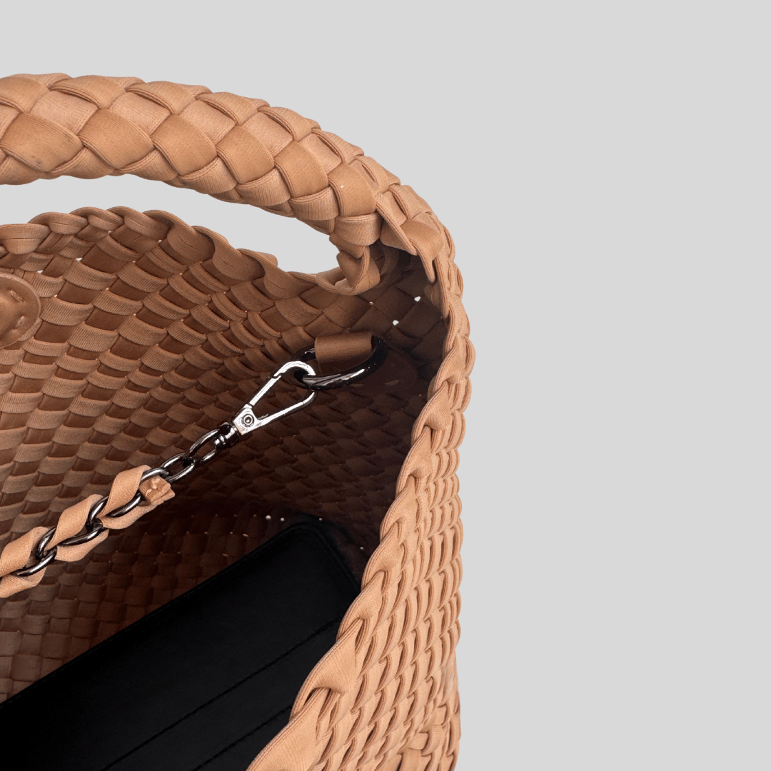 Cuenta con strap desmontable de cadena para ser utilizada como crossbody