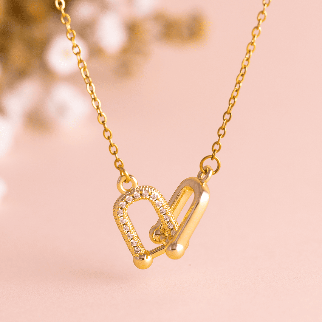 Dos piezas tipo herradura entrelazadas, una de ellas con detalles de incrustaciones y la otra pieza lisa.