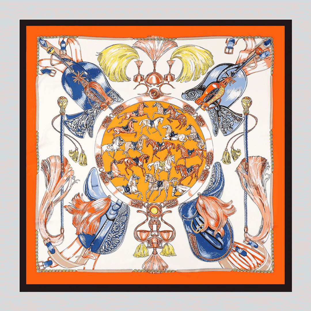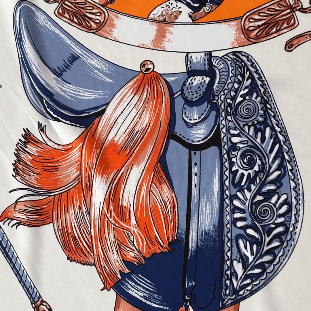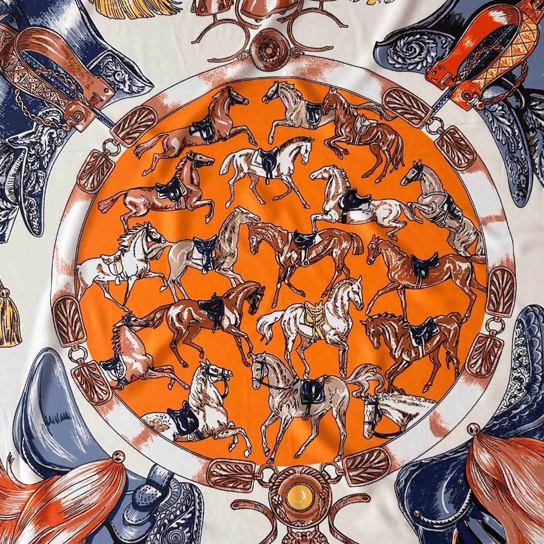 Mascada de diseño ecuestre con plumas y albardones, con caballos al centro