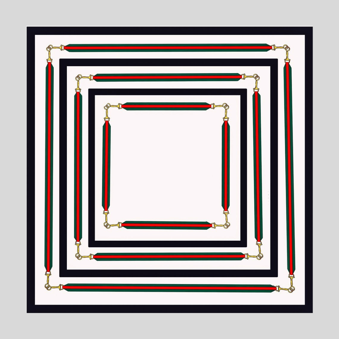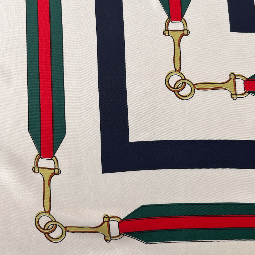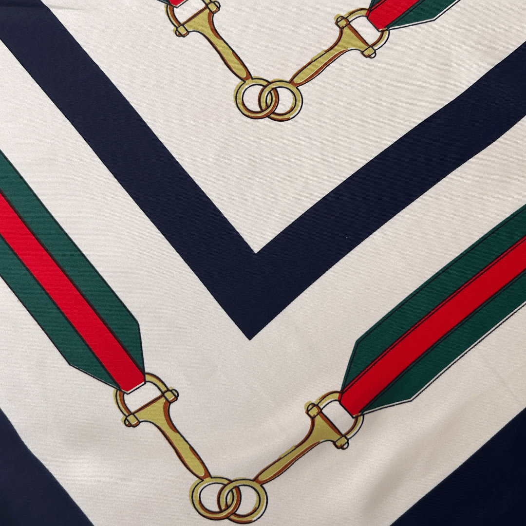 Mascada de diseño ecuestre, con bocados y cintas en tonos azul, rojo y verde