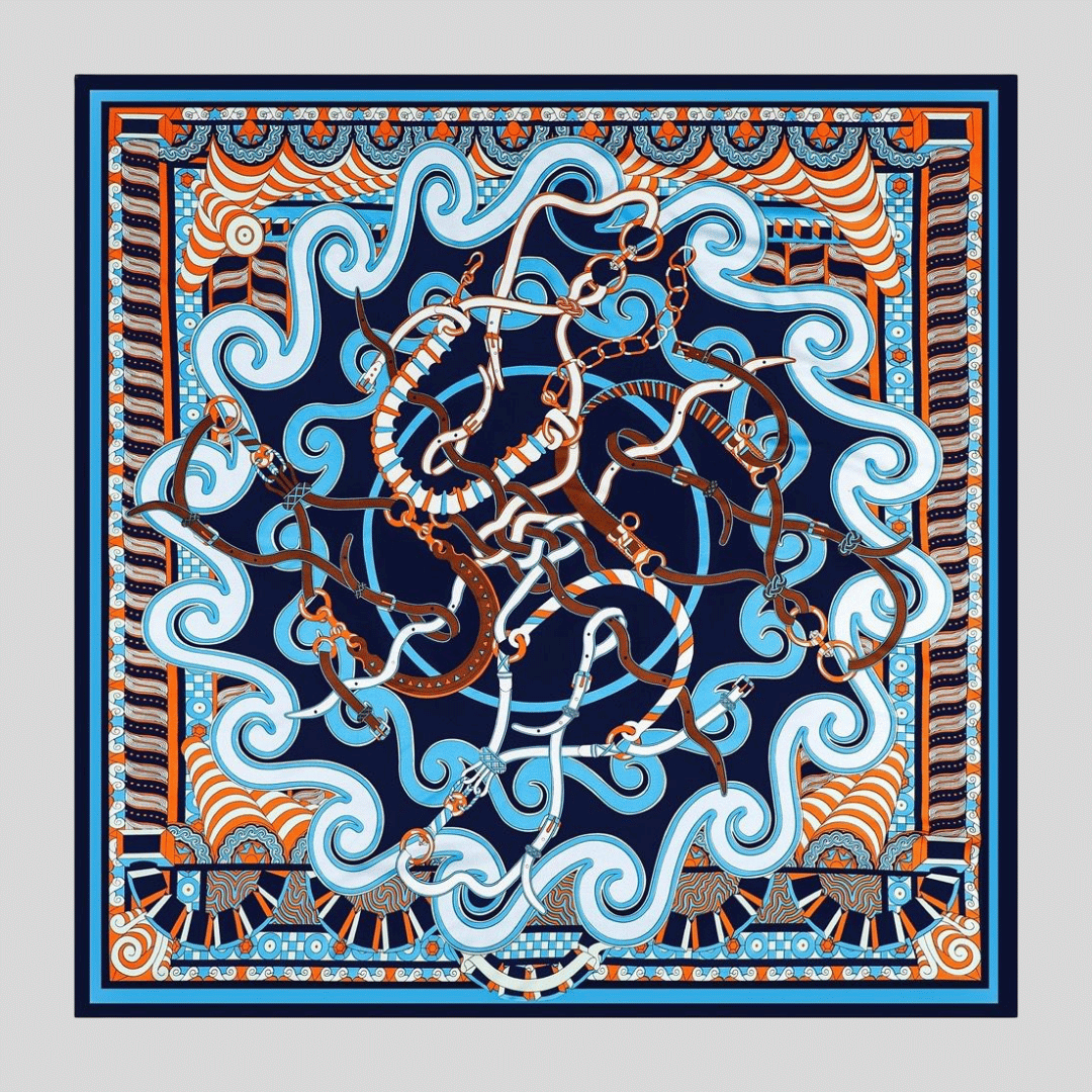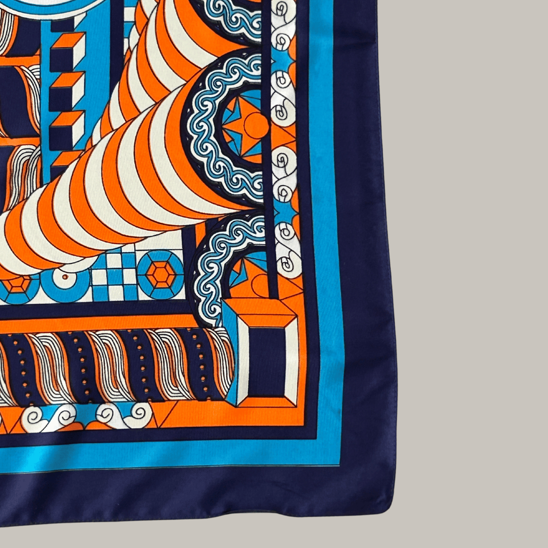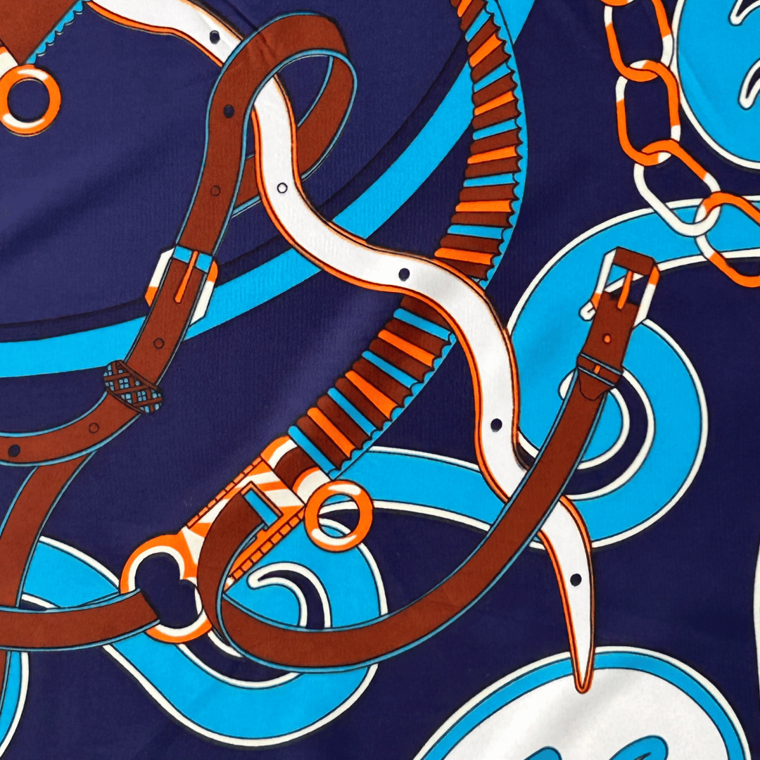Mascada de diseño ecuestre en tonos azul y naranja.